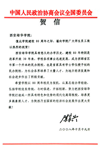 为庆典大会发来贺信及题词的领导有:全国人大常委副委员长、民革中央主席周铁农;全国政协副主席、农工民主党中央常务副主席陈宗兴;全国妇联主席、第十届全国人大副委员长、中国关工委主任顾秀莲;教育部常务副部长袁贵仁;国务院稽查特派员、中华教育艺术研究会理事长刘吉;国务院国资委国有资产监事会主席、北大国民素质研究中心主任解思忠;中国关工委副主任杨志梅;全国人大法制委副主任万绍芬;中国关工委执行主任、原中组部常务副部长王照华;原国家教委副主任、全国人大科教文卫委员会原副主任杨海波;原司法部部长邹瑜;原民政部部长崔乃夫;中国教育基金会理事长、原教育部常务副部长张保庆;中华国际民营企业促进会会长、原国家工商总局副局长、原国家工商行政管理局局经济检查司司长牛鸿瑞;中科院原副院长、中科院院士 2007国家科学技术获奖得者李振声;中国工程院院士孙九林;中华国际品牌协会会长、原中国质量管理协会理事长解艾兰;著名教育家、国学大师、演讲家、中华教育研究会常务副理事长李燕杰;陕西省省长袁纯清;陕西省委副书记、教工委书记王侠;原中共陕西省委书记张勃兴;原陕西省省长程安东;原陕西省政协副主席范明;日本执政党—公明党党首大田昭宏,日本政府内阁建设大臣国土厅长官中山正晖;日本创价学会名誉会长池田大作,京都市立艺术大学校长潮江宏三等。