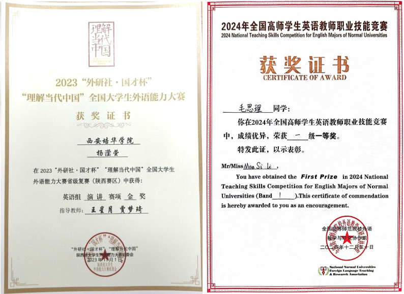 近年来,英语专业学生在各类竞赛中表现优异,累计获奖超过100人次,国家级奖项15项,省级以上奖项40余项,竞赛参与覆盖率超过80%。“竞赛育人”效果显著,积极的竞赛参与不仅提高了学生的学习效率和学业水平测试,获奖学生就业率高达98%以上,竞赛经验同时也反哺了课堂教学,推动了《跨文化交际》《英语演讲》《汉英翻译》等课程的教学改革。