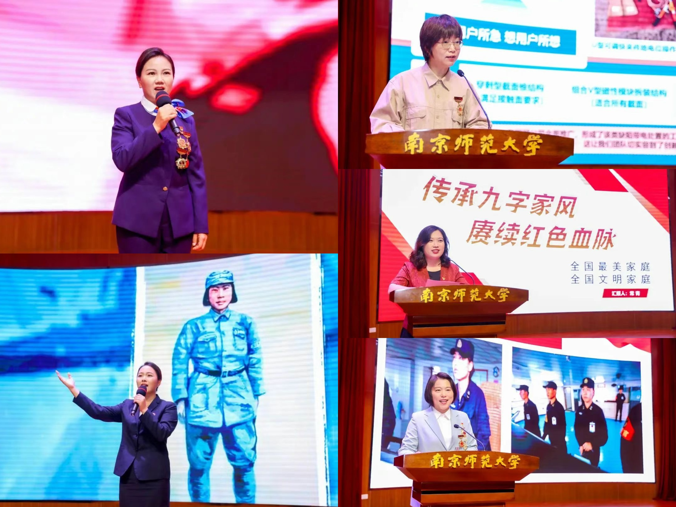 来自各行各业的五位巾帼模范分享了她们的奋斗故事与精神感悟。杨靖宇将军曾外孙女,全国文明家庭、河南省模范教师常青讲述了家庭传承红色家风的故事,强调了“严要求、重责任、懂知足”的家教传统以及将烈士故事融入思政教学的实践。南京市雨花台烈士陵园管理局社会教育处讲解员姜慧讲述了抗战中孙晓梅烈士的英勇事迹,激励青年学子传承英烈精神。全国三八红旗手、全国劳动模范,国网无锡供电公司电缆运检中心主任何光华讲述了自己从基层成长的历程,强调创新源于对工作的精益求精。全国见义勇为模范、江苏省三八红旗手标兵,江苏沿江高速公路有限公司江阴新桥服务区安全员陈传香分享了她见义勇为和社会服务的感人故事,并勉励同学们保持初心、乐于助人。全国三八红旗手、全国劳动模范,江苏省盱眙县黄花塘镇芦沟社区党总支书记、居委会主任徐玲分享了自己从航母女舵手到乡村振兴领头人的经历,呼吁女大学生在实践中绽放光彩。