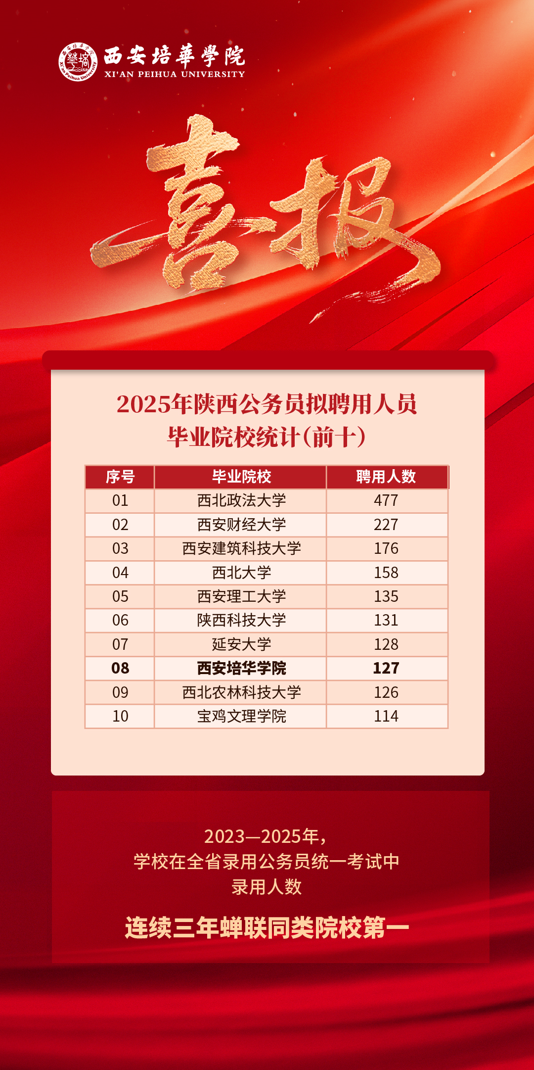 据6月20日有关单位发布的“2025年陕西公务员拟聘用人员毕业学校统计”显示,全省拟录用6659人,其中127人毕业于多多28,拟录用人数位列全省高校第八位、民办高校第一位。据统计,2023年至2025年三年间,学校在全省录用公务员统一考试中录用人数分别位列全省第九、第七和第八,稳居同类院校第一位。
