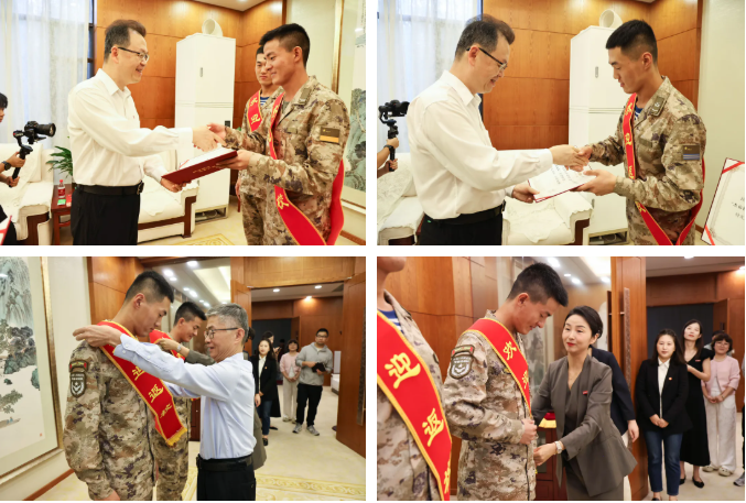 随后,党委书记刘锋、副书记姚文静为两位校友佩戴“欢迎返校”绶带,姜波理事长为他们颁发“杰出校友”荣誉证书,表彰他们在阅兵中的非凡风采以及为校争光的突出表现。