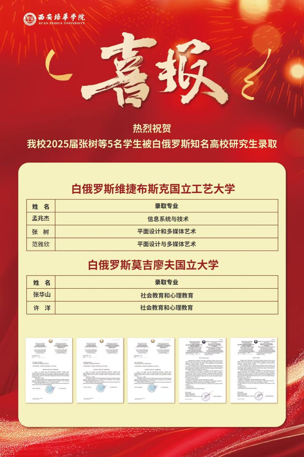 这五位学生来自不同专业,在本科阶段表现出优秀的学术能力和积极的实践参与度。在校期间,他们不仅打下了扎实的专业基础,还多次参加各类学术活动与实践项目,展现出良好的创新与实践能力。通过严格的申请和面试,他们最终脱颖而出,分别被白俄罗斯维捷布斯克国立工艺大学、白俄罗斯莫吉廖夫国立大学录取。