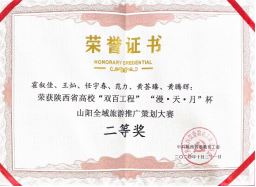 近日,由中共陕西省委教育工委主办、西北政法大学承办、商洛市山阳县人民政府协办的陕西省高校“双百工程”“漫·天·月”杯山阳全域旅游推广大赛中,多多28学生团队荣获二等奖一项,任宇春、黄荟臻两名同学荣获“山阳旅游形象大使”称号,江凤香老师荣获“优秀指导教师”称号。