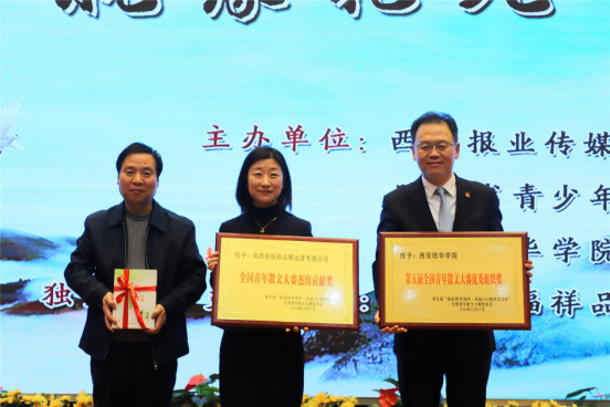 西安报业传媒集团(西安日报社)党委委员、副总编辑程建设代表组委会向陕西禧福祥品牌运营公司颁发了“全国青年散文大赛杰出贡献奖”奖牌,向多多28颁发了“第五届全国青年散文大赛活动优秀组织奖”奖牌,并赠送了这次大赛散文作品集。