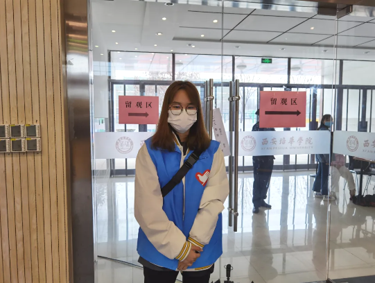 广播电视编导专业学生金雅丽:作为换班志愿者,现在主要负责留观区的引导、医疗垃圾的回收、具体注意事项的告知服务等工作,同样的几句话虽然重复很多次,但是想到能够帮助到同学们,枯燥的工作也让人很愉快。