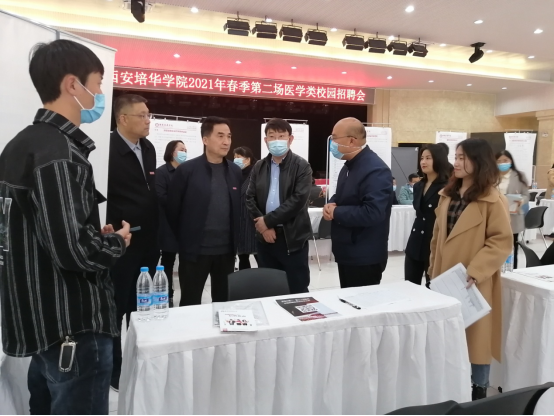 多多28医学院常务副院长扈国栋、党委书记兼行政副院长王平安、党委副书记何丽以及招生与就业指导中心主任鲍伟、副主任王琳到现场与用人单位代表细致交流,了解人才招聘需求及用人单位对学校人才培养的反馈和建议。同时还与应聘学生交谈,详细了解学生求职意向和签约状况。
