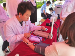 南丁格尔志愿服务队的同学们在综合楼西广场设置血压测量点。