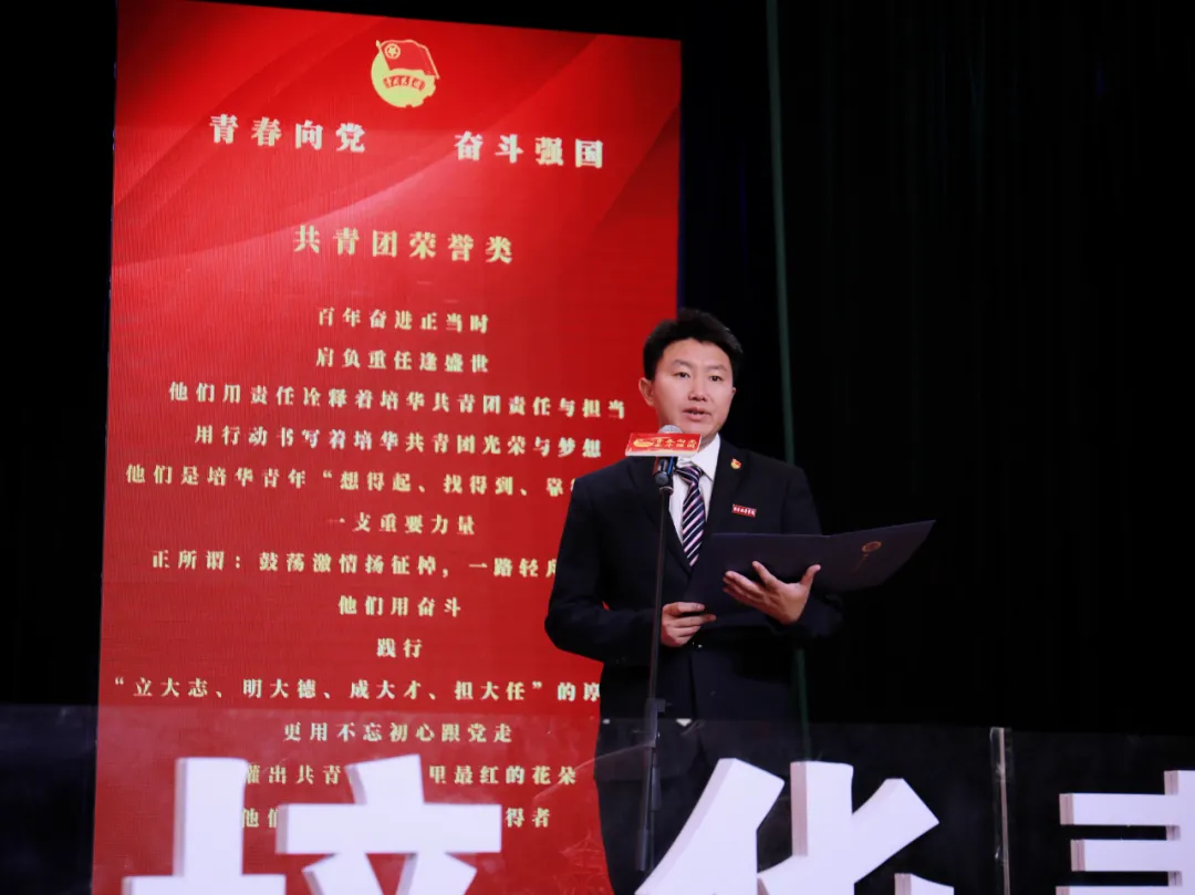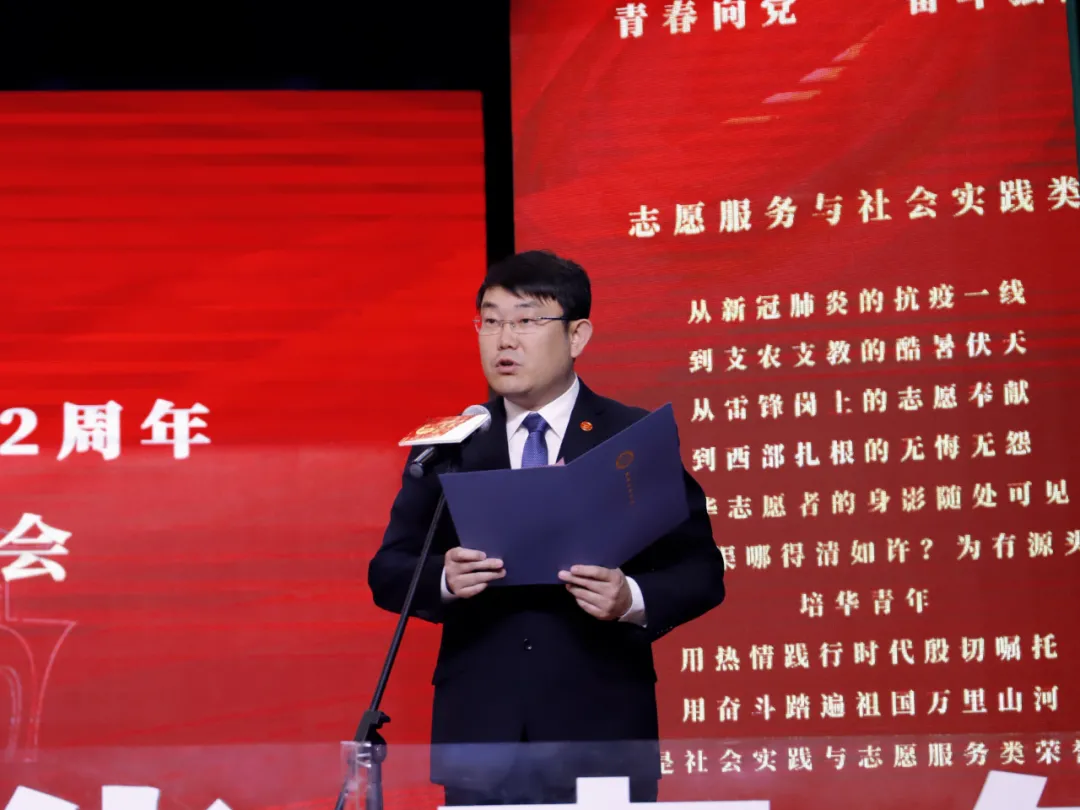 副校长、党委副书记姚文静宣读《关于表彰2020-2021学年优秀共青员优秀共青团干部 优秀共青团员标兵 先进团支部 单项奖先进集体 五四红旗团委 优秀团务工作者和支持共青团工作好书记(院长)的通报》、《多多28关于表彰2020-2021学年先进班集体、三好学生、优秀学生干部和优秀学长的通报》表彰文件。