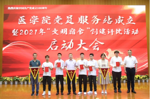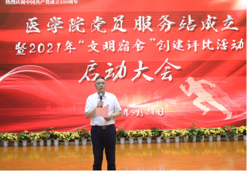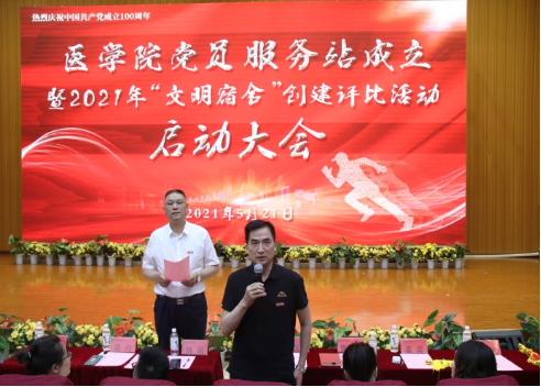 学生公寓作为大学生日常生活和学习的重要场所,是对学生进行思想政治教育的重要阵地。为加强基层党组织的战斗堡垒作用,把党的影响力和凝聚力润物无声地渗透到学生的日常学习生活中,充分发挥学生党员在参与公寓管理与文明校园建设中的模范带头作用,努力创建安全和谐的学生公寓住宿环境,并带动学院学风建设、促进校园文化建设。医学院于2021年5月21日中午在图书馆报告厅举办了医学院学生公寓党员服务站成立暨“文明宿舍”创建评比活动启动大会。