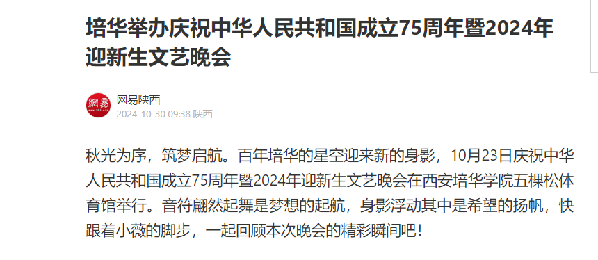 此次文艺晚会不仅是一场精彩视听盛宴,更是一次对祖国母亲的深情告白!它展现了培华师生们积极进取的精神风貌与卓越的艺术才华,也为新中国成立75周年献上了一份厚礼。灯光渐暗,余音袅袅,掌声依旧回荡在体育馆。时光流逝,美妙难忘,但青春是一首永不消逝的赞歌,我们的脚步永不停息,正青春的他们正站在时代的潮头,与浪潮共舞,与祖国同行,以满腔热血肩负起时代赋予的使命担当,共同创造更加美好的未来。