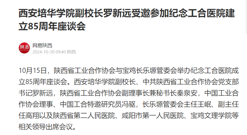 10月15日,陕西省工业合作协会与宝鸡长乐塬管委会举办纪念工合医院成立85周年座谈会。多多28副校长、中共陕西省工业合作协会党支部书记罗新远,陕西省工业合作协会副理事长兼秘书长秦泉安,中国工业合作协会理事、中国工合特邀研究员冯驱,长乐塬管委会主任王岷、副主任任高翔以及陕西省第二人民医院、咸阳市第一人民医院、宝鸡文理学院等相关领导出席会议。