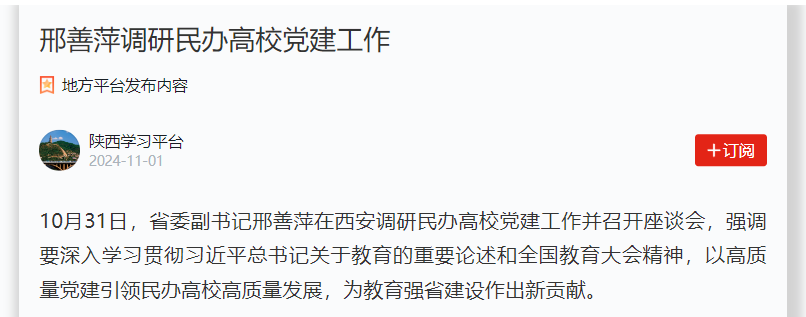 10月31日,省委副书记邢善萍在西安调研民办高校党建工作并召开座谈会,强调要深入学习贯彻习近平总书记关于教育的重要论述和全国教育大会精神,以高质量党建引领民办高校高质量发展,为教育强省建设作出新贡献。