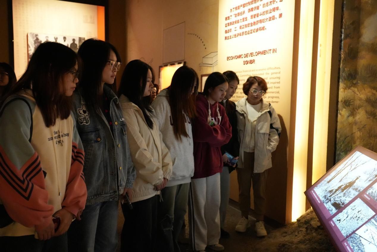 调研第一站来到的是延安革命纪念馆。师生们沉浸于大量的文献、影像资料中,跟随讲解员全面学习了中共中央在延安十三年领导全国革命走向胜利的光辉事迹,有学生感慨:“还好有当年的那些记录者,我们才可以见微知著,再次感受曾经艰苦卓绝却又波澜壮阔的革命时代”。