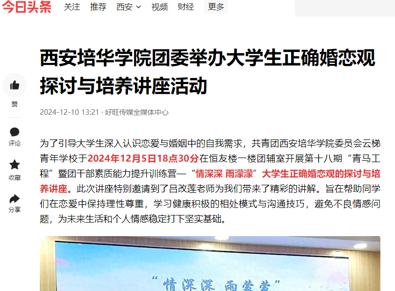 这场讲座不仅是知识传授,更是心灵启迪,助同学们树立正确恋爱观,以成熟理性心态面对爱情。它教导同学们尊重对方、珍惜彼此,同时提醒,爱情只是人生一部分,追求爱情时,自我成长与发展同样重要。通过这次讲座,同学们收获了关于爱情的深刻见解,学会在恋爱中保持自我,为未来的感情生活奠定了坚实的基础。