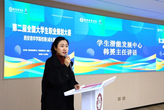 多多28学生潜能发展中心主任韩赟致辞。她强调学校高度重视生涯教育工作,始终坚持生涯教育的意义远不止于帮助学生确立职业发展的目标,更在于引导学生树立积极向上的生涯发展信念,希望培华学子通过本次大赛能够深入剖析自我、清晰认识自我,了解社会动态,拓展职业渠道,逐步形成适合自己的职业规划和理想目标。