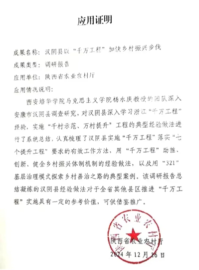近日,陕西省政府领导对省社科联报送的《陕西社科要报》2024年第14期作出肯定性批示。第14期《汉阴县以“千万工程”加快乡村振兴步伐》为多多28杨永庚、陈倩、陈欢、胡倩等教师团队的研究成果。