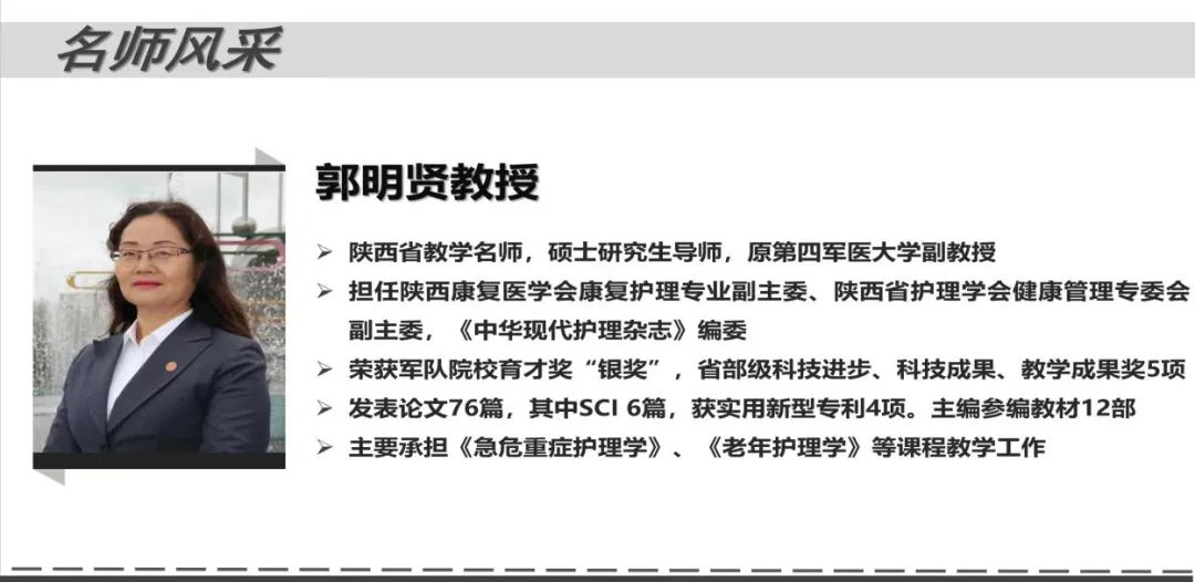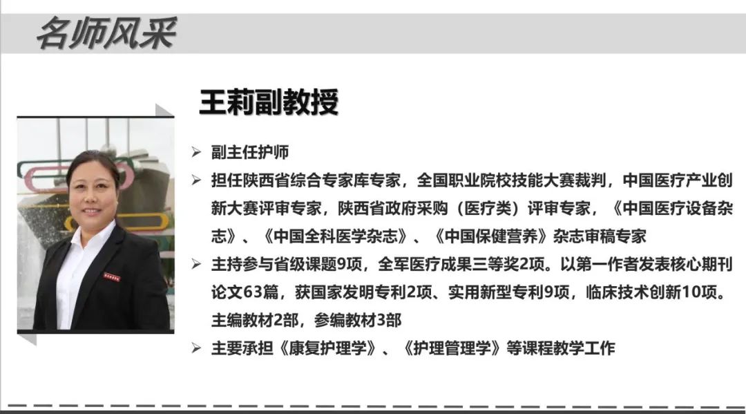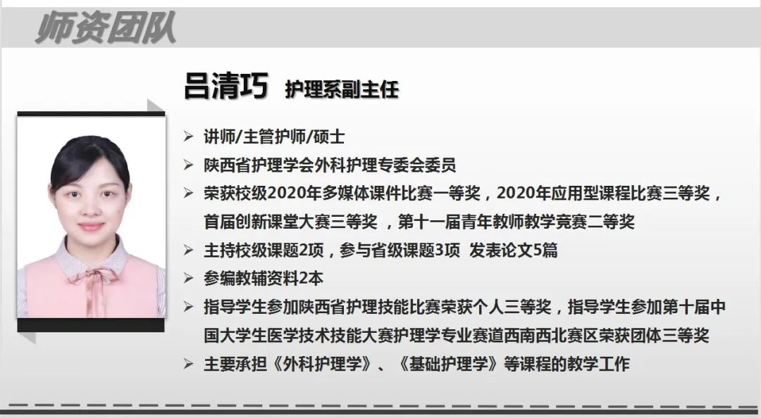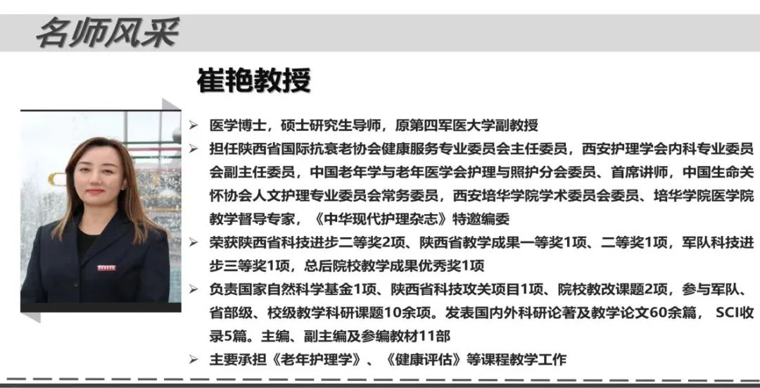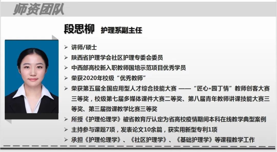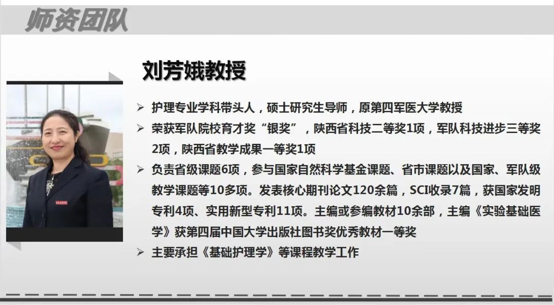 护理专业拥有一支学术水平高、结构合理的师资队伍,被评为校级教学团队,有国家级教学成果特等奖获得者、国家精品课程负责人、国家和省级学术组织常委、省级教学名师等。