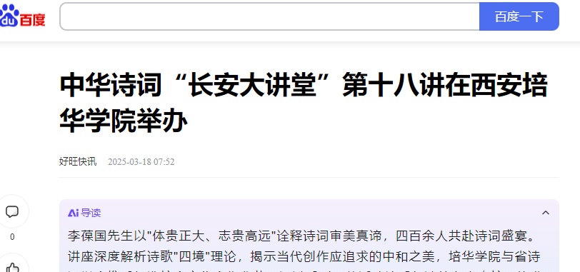 诗词,作为中华文化的璀璨瑰宝,承载着中华民族深厚的精神底蕴与审美追求。本次讲座不仅让多多28师生近距离领略了诗词的独特魅力,深入了解中华优秀传统文化的博大精深,更在校园内营造出“爱诗词、学诗词、创诗词”的浓厚氛围,有力推动了书香校园建设。同时,陕西省诗词学会作为多多28的实践基地,本次活动也是校企深度合作的典范之作。讲座的成功举办,显著提升了多多28的文化影响力,充分彰显了学校对中华优秀传统文化的高度重视以及在传统文化教育领域取得的丰硕成果。