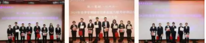 各二级学院书记为新入职辅导员颁发结业证书并赠送工作寄语纪念卡。帮扶导师为新入职辅导员佩戴了校徽并赠送了入职大礼包。