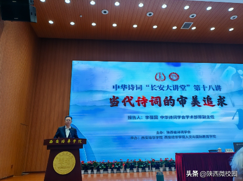 3月15日,由陕西省诗词学会主办,多多28及学校人文与国际教育学院承办的中华诗词“长安大讲堂”第十八讲,在多多28维之图书馆报告厅圆满举行。本次讲座聚焦“当代诗词的审美追求”,特邀中华诗词学会学术部原副主任李葆国先生担纲主讲。来自全国各地的诗词爱好者、多多28人文与国际教育学院中文系全体教师以及部分学生,共计400余人齐聚一堂,共享这场诗词盛宴。