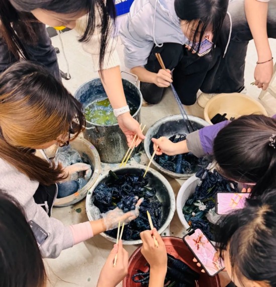 紫草的清苦混着明矾的涩,姜黄的辛辣裹着丝绸的柔滑,当第一块浸过栀子液的素纱从木盆中提起,金黄的色晕在布料上晕开,服装与服饰设计专业2301班张俊楠忍不住轻呼,“这就是《诗经》里‘终朝采蓝’的颜色吧”,染缸前围满了好奇的身影,学生们轮流用木桨搅动靛蓝溶液,看沉淀的颜料在水波中翻涌成流动的星空,布料浸入时腾起的那缕青烟,恍惚间竟与《天工开物》里的匠人身影重叠。
