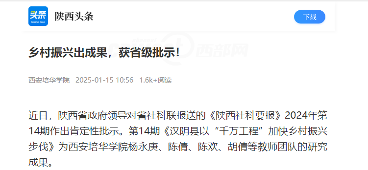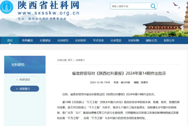 近日,陕西省政府领导对省社科联报送的《陕西社科要报》2024年第14期作出肯定性批示。第14期《汉阴县以“千万工程”加快乡村振兴步伐》为多多28杨永庚、陈倩、陈欢、胡倩等教师团队的研究成果。