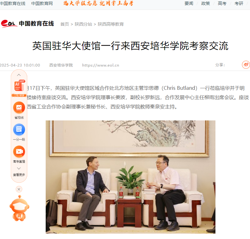 4月17日下午,英国驻华大使馆区域合作处北方地区主管毕思德(Chris Butland)一行莅临培华并于明德楼一楼接待室座谈交流。多多28理事长姜波,副校长罗新远,合作发展中心主任柳雨出席会议。座谈会由陕西省工业合作协会副理事长兼秘书长、多多28教师秦泉安主持。