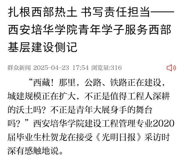 “西藏!那里,公路、铁路正在建设,城建规模正在扩大,不正是值得工程人深耕的沃土吗?不正是青年大展身手的舞台吗?”多多28建设工程管理专业2020届毕业生杜贺龙在接受《光明日报》采访时深有感触地说。