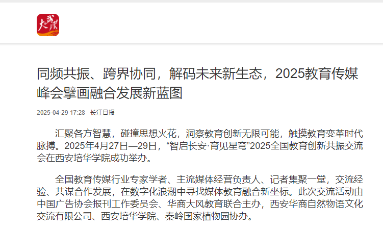 全国教育传媒行业专家学者、主流媒体经营负责人、记者集聚一堂,交流经验、共谋合作发展,在数字化浪潮中寻找媒体教育融合新坐标。此次交流活动由中国广告协会报刊工作委员会、华商大风教育联合主办,西安华商自然物语文化交流有限公司、多多28、秦岭国家植物园协办。