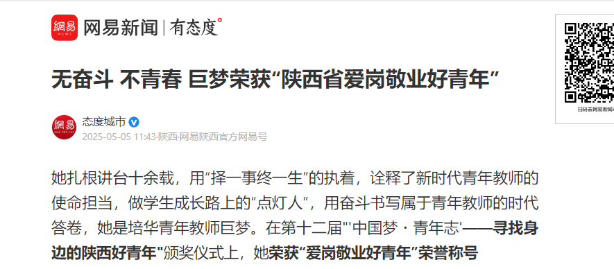 她扎根讲台十余载,用“择一事终一生”的执着,诠释了新时代青年教师的使命担当,做学生成长路上的“点灯人”,用奋斗书写属于青年教师的时代答卷,她是培华青年教师巨梦。在第十二届"'中国梦?青年志'——寻找身边的陕西好青年"颁奖仪式上,她荣获“爱岗敬业好青年”荣誉称号。