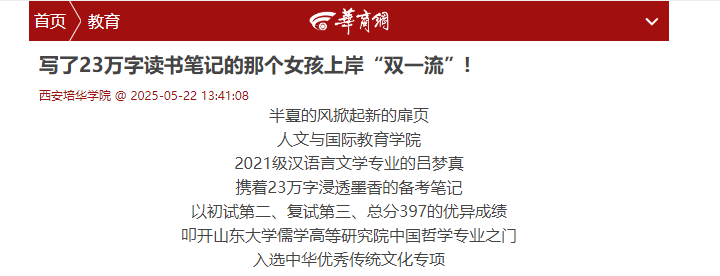 半夏的风掀起新的扉页,人文与国际教育学院2021级汉语言文学专业的吕梦真,携着23万字浸透墨香的备考笔记,以初试第二、复试第三、总分397的优异成绩,叩开山东大学儒学高等研究院中国哲学专业之门,入选中华优秀传统文化专项。