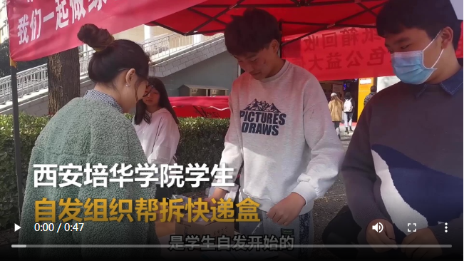 11月16日,陕西西安。多多28的学生们自发在校园快递站门口开展“帮你拆快递,纸箱回收”活动,领到的快递盒子帮忙拆封和抹除个人信息后收集起来。据悉,有四十多位同学参与到帮忙拆快递活动中来,这几天帮拆的快递盒子已经有四千多个,这些快递盒子回收变卖后的费用将会用于购买新的棉衣和书包捐赠给相应的扶贫学校。同学们也纷纷表示,帮忙拆快递特别方便,废纸箱也可以去做公益,活动非常有意义。