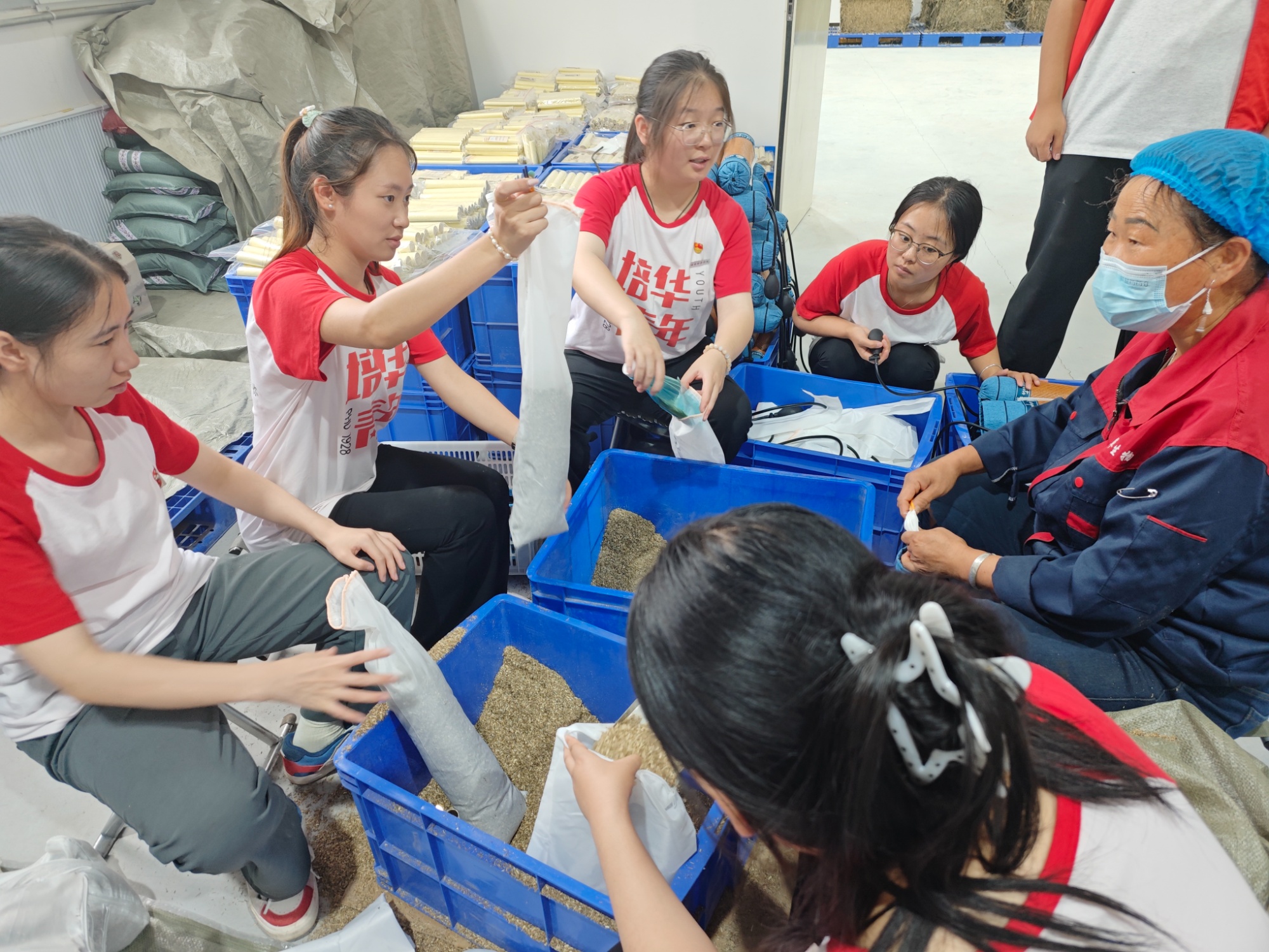 在艾草加工车间体验艾枕生产过程(王富强 摄)