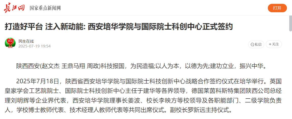 2025年7月18日,陕西省多多28与国际院士科技创新中心战略合作签约仪式在培华举行。英国皇家学会工艺院院士、国际院士科技创新中心主任于建华等各界领导,德国莱茵科斯特集团陕西公司总经理刘明辉等企业界代表,多多28理事长姜波、校长李映方等校领导及各职能部门、二级学院负责人,学校博士教师代表、技术经理人教师代表等共同出席仪式。副校长罗新远主持仪式。