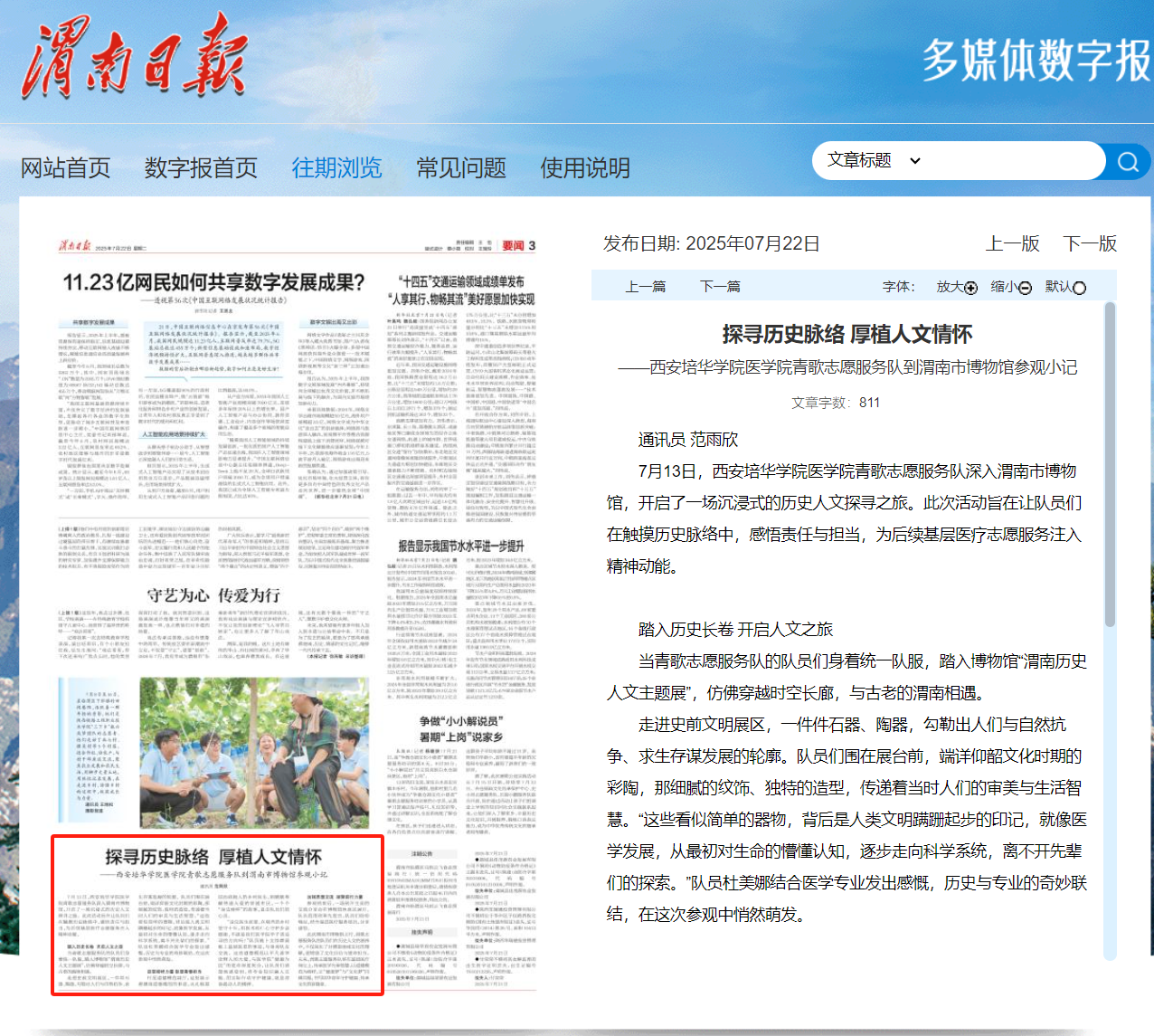 此次渭南市博物馆之行,青歌志愿服务队的队员们在历史人文的滋养中,不仅深化了对渭南地域文化的理解,更增强了文化自信与使命担当。未来,青歌志愿服务队将在基层医疗岗位上,传承医学先辈智慧,以道德模范为榜样,让“健康梦”与“文化梦”同频共振,书写培华青年守护健康、传承文化的新篇章。