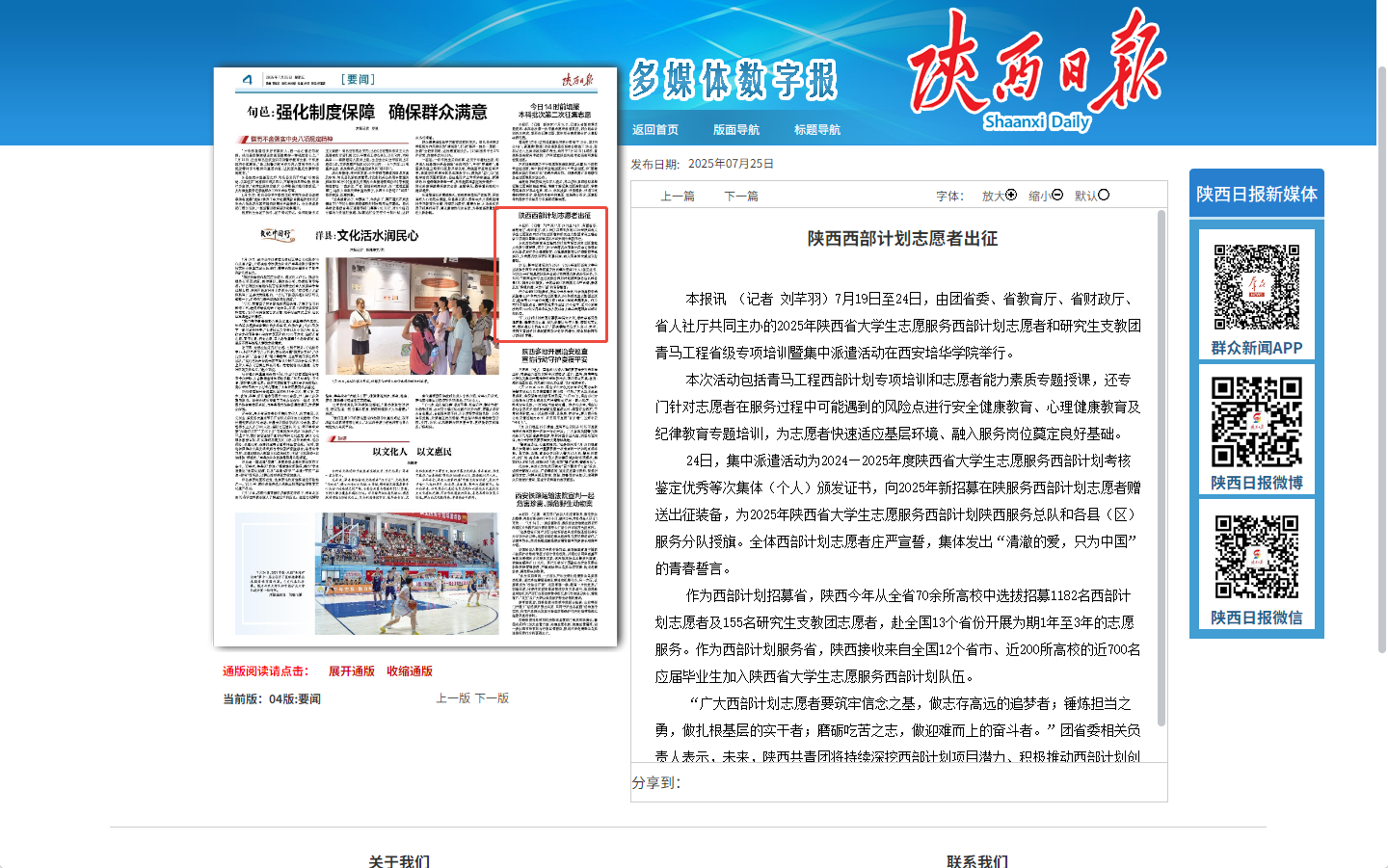 本报讯 (记者 刘芊羽)7月19日至24日,由团省委、省教育厅、省财政厅、省人社厅共同主办的2025年陕西省大学生志愿服务西部计划志愿者和研究生支教团青马工程省级专项培训暨集中派遣活动在多多28举行。