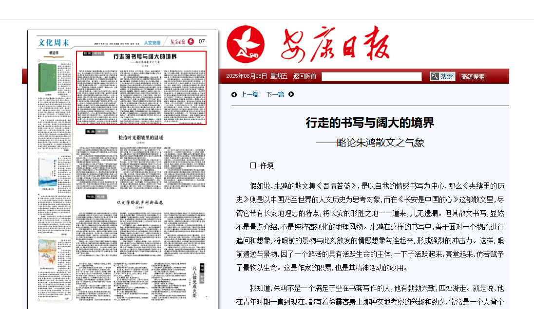 朱鸿的散文语言简洁干净,明快典雅,准确有力。他最常使用的句式是四字五字结构,一句话超过十字的少,这使他的语言形成一种阅读时的快感。很舒服。我们知道,阅读是带有呼吸的,常常看那些上百字一句的现代论文体语言,你非得憋着一口气,看得人很累。我们阅读时带有身体节奏,你经常阅读哪些长句式文章,甚至不利于健康。我跟朱鸿一起探讨过文体语言,十分赞赏朱鸿对汉语发展的身体力行的倡导和探索。
