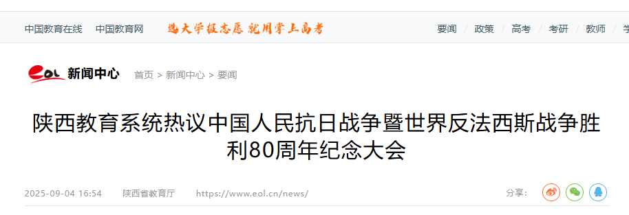 2025年9月3日,中国人民抗日战争暨世界反法西斯战争胜利80周年纪念大会在京隆重举行,中共中央总书记、国家主席、中央军委主席习近平发表重要讲话并检阅部队。陕西省教育系统广大干部师生员工高度关注,纷纷通过网络、电视、报纸、广播、微信微博等媒体收听收看大会盛况,深入学习习近平总书记重要讲话精神,习近平总书记的重要讲话在全省教育系统引发热烈反响。