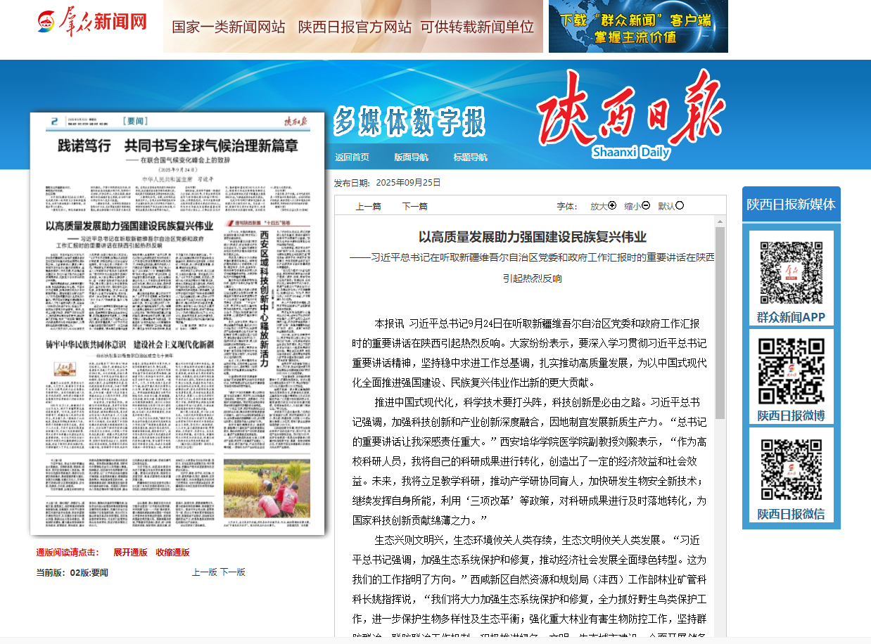 本报讯 习近平总书记9月24日在听取新疆维吾尔自治区党委和政府工作汇报时的重要讲话在陕西引起热烈反响。大家纷纷表示,要深入学习贯彻习近平总书记重要讲话精神,坚持稳中求进工作总基调,扎实推动高质量发展,为以中国式现代化全面推进强国建设、民族复兴伟业作出新的更大贡献。