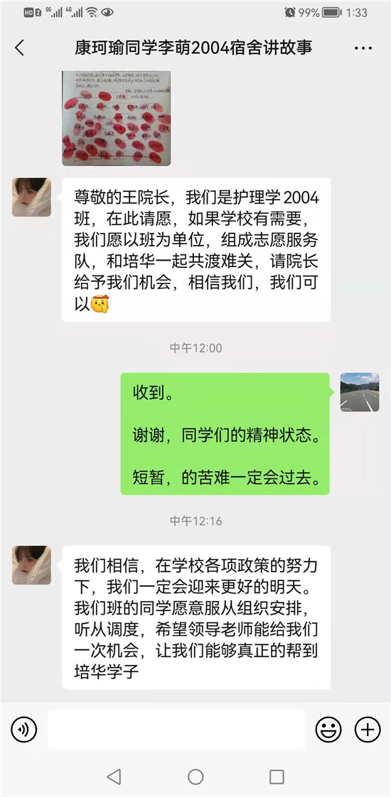 大家在《请战书》中说:当新冠疫情再度来袭,不断攀升的数字,让人揪心、痛心,作为一名医学生,我们希望能肩负起学生的使命,用实际行动践行医学生的誓言。健康所系,性命相托。护理学2004班全体同学自愿加入此次抗击疫情的工作中去,并承诺在工作期间服从组织调度安排。我们愿意在祖国需要、西安需要、培华需要我们的时候挺身而出,绝不退缩,请院领导老师给予机会并相信我们,我们可以。