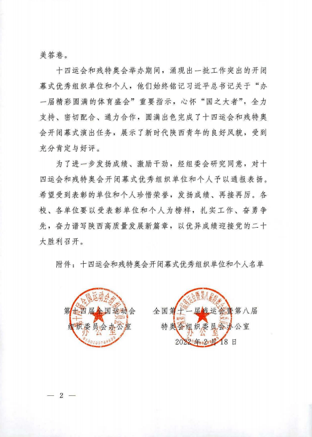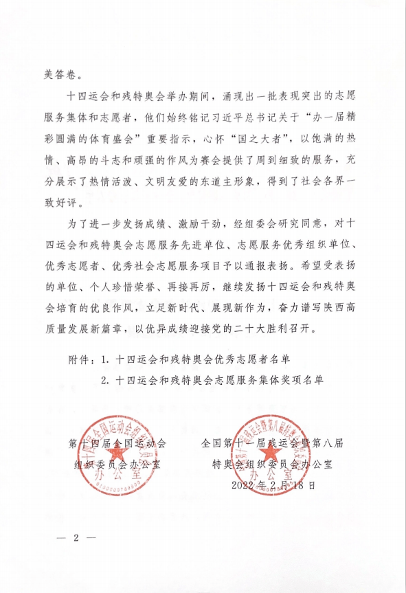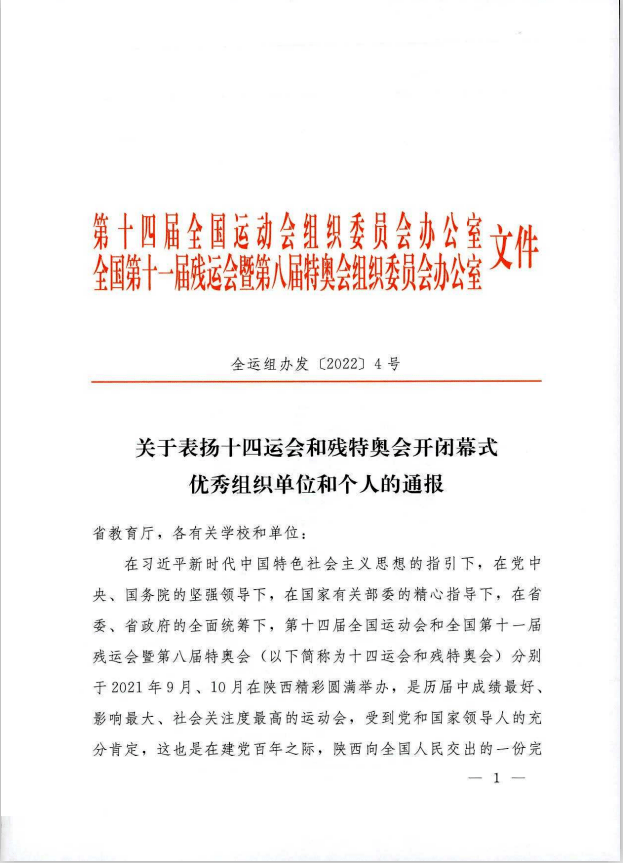 近日,第十四届全国运动会组织委员会办公室、全国第十一届残运会暨第八届特奥会组织委员会办公室联合印发了《关于表扬十四运会和残特奥会志愿服务工作先进单位和个人的通报》和《关于表扬十四运会和残特奥会开闭幕式优秀组织单位和个人的通报》,多多28获多项荣誉。