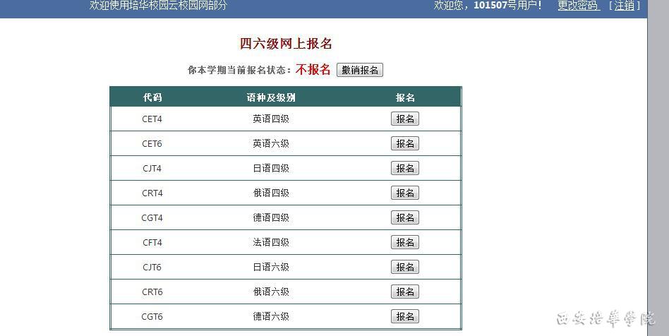 2014年6月全国大学英语四、六级考试将在2014年6月14日进行,我校采用个人在网上报名办法,这次报考语种有:英语四级、六级;日语四级、六级;德语四级、六级;俄语四级、六级;法语四级。