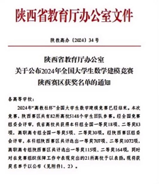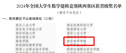 近日,陕西省教育厅发布了《关于公布2024年全国大学生数学建模竞赛陕西赛区获奖名单》,培华学子在本次竞赛中取得优异成绩,共19支参赛队获奖,其中获得国家二等奖2项,省一等奖5项,省二等奖12项,多多28被评为同类院校唯一优秀组织先进单位。