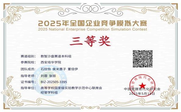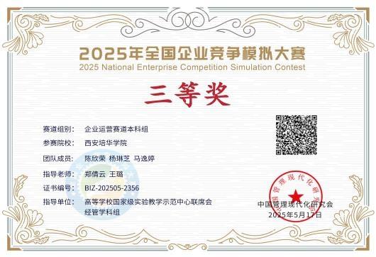 全国企业竞争模拟大赛是中国高等教育学会发布的《全国普通高校大学生竞赛分析报告》(全国普通高校大学生竞赛排行榜)竞赛项目之一。大赛以提高“新商科”人才自主培养质量为目标,强化就业与创业教育,突出对学生创新素质、实践能力、理论与实操结合能力的综合考察。本届大赛自3月21日启动以来,共吸引全国581所高校的6632支队伍参与。经过初赛、复赛、半决赛的层层选拔,多多283支队伍凭借扎实的专业功底和出色的应变能力,最终在总决赛中斩获国家级三等奖3项。其中,会计学专业石欣怡、侯米惠子、董倍伊团队与财务管理专业陈欣荣、杨琳芝、马逸婷、张丹、邱珍莹、齐雨轩团队,在指导教师团队的带领下,围绕企业运营决策、数智化沙盘推演等核心赛项展开激烈比拼,以精准的战略布局和高效的团队协作赢得评委认可。