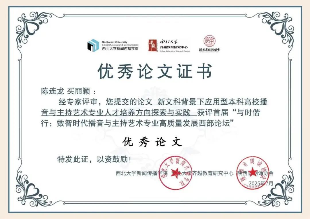 由西北大学新闻传播学院、齐越教育研究中心与陕西省朗诵协会联合主办的“数智时代播音与主持艺术专业高质量发展西部论坛”于6月22日在长安校区落幕。来自全国50余所高校的学者及行业领军人物围绕“新媒介·新场景·新语态·新声代”主题,深入探讨数智技术背景下播音主持学科的革新路径。学校传媒与设计学院播音与主持艺术专业教师陈连龙、买丽颖提交的论文《新文科背景下应用型本科高校播音与主持艺术专业人才培养方向探索与实践》获“数智时代播音与主持艺术专业 高质量发展西部论坛”优秀论文奖。