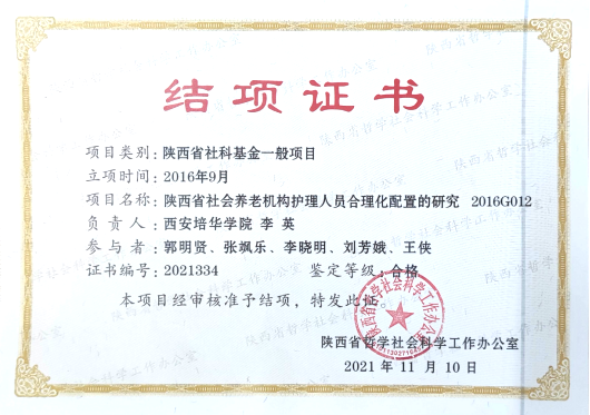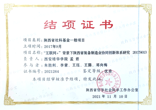 学校会计与金融学院孟君老师主持的项目《“互联网+”背景下陕西省装备制造业协同创新体系研究》(编号2017S013)以及医学院李英老师主持的项目《陕西省社会养老机构护理人员合理化配置的研究》(编号2016G012)顺利获批结项。其中,孟君老师的项目被评为优秀级,是学校在该省级人文社科标杆类项目评选中首次获评优秀结项。