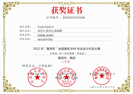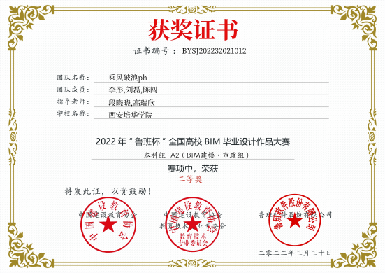 为推动高等教育高质量发展,培养创新性人才,中国建设教育协会举办了2022年“鲁班杯”全国高校BIM毕业设计作品大赛。我校建筑与艺术设计学院积极组织学生参赛,在长达半年的备赛过程中,学生团结协作、细致认真,最终斩获BIM建模赛项房建组一、二、三等奖各一项,BIM建模市政组二、三等奖各一项,建筑与艺术设计学院老师高瑞欣、段晓晓、翟颖获得优秀指导教师奖。