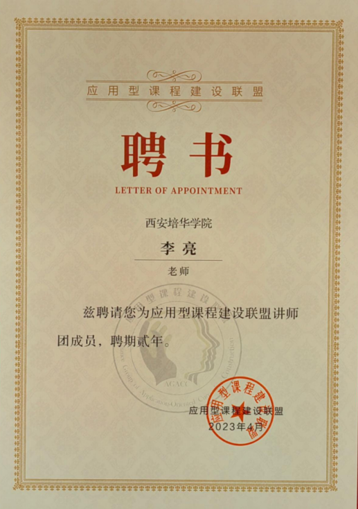 医学院老师李亮受聘为第三批联盟讲师团成员聘书