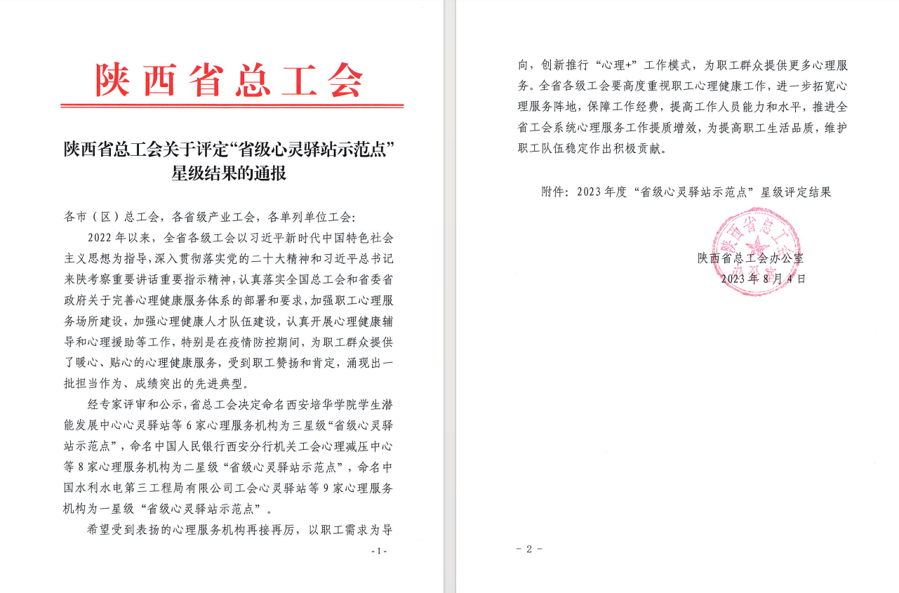 《陕西省总工会关于评定“省级心灵驿站示范点”星级结果的通知》文件