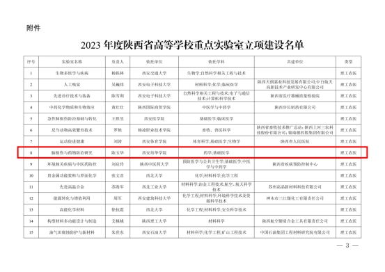 近日,陕西省教育厅公布了2023年度陕西省高等学校重点实验室立项建设名单,由学校医学院陈玉华教授牵头申报的“脑损伤与药物防治研究陕西省高等学校重点实验室”获批立项建设。
